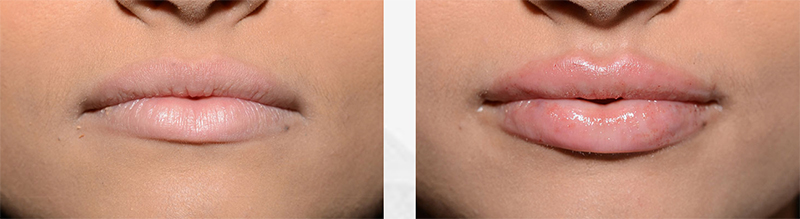 Fat injections are another option. Fat requires no foreign material, and is very safe. Unfortunately, fat can be difficult to control and may become lumpy or resorb unpredictably, so consistent results can be challenging. Furthermore, the lip may have more bleeding, bruising and swelling since the fat graft requires a larger cannula or needle for placement.